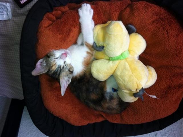Dina ha sido abandonada a su suerte junto con su hermana. Unos chicos las llevaron a casa de mi compañera porque las había encontrado de noche en la calles. Aún tenían los ojos sin abrir y estaban muertas de frío. La madre de una de nuestras compañeras de GPAR se está encargando de mantenerlas con vida alimentándolas con biberón. Ya han abierto sus ojitos pero todavía no estan destetadas. Dina es muy dormilona, y también le encanta que le toques la barriguita cuando termina de comer. Tiene un pelo muy bonito y es muy cariñosa.