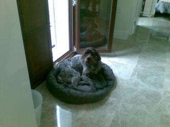 Por suerte una pareja de Sevilla se interesó por él y vinieron desde sevilla a por él. Cuando lo vieron se quedaron encantados y por lo que nos cuentan se ha adaptado genial a ellos. En las fotos lo podemos ver en su camita y en el parque donde lo sacan a pasear.