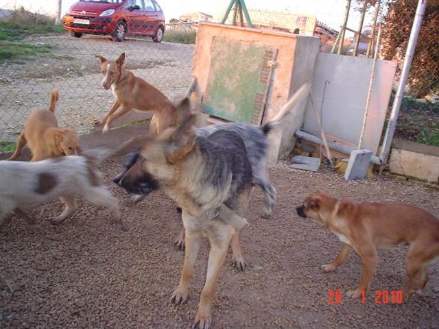 Ayer al llegar de limpiar el refugio y después de darle un poquito de cariño a nuestros perros, ya cansadas y muy mojadas mi compañera y yo....recibimos una llamada urgente de la policía municipal. Una perra de raza pastor alemán se había metido en el huerto de una persona mayor, ya anciana. La mujer estaba muy asustada y no sabía qué hacer con ella. Llamó a la Guardia Civil y ellos a la policía municipal. Bueno, a pesar de lo que llovía nos volvimos a cambiar de ropa y allí fuimos. Llevamos comida y todo fue muy fácil, Laika era noble y estaba muerta de frío, miedo y hambre. Se vino con nosotras dócilmente. La tarde estaba tremendamente fría, húmeda y parecía que iba a nevar. Todo acabó felizmente, Laika se vino con nosotras al refugio.
