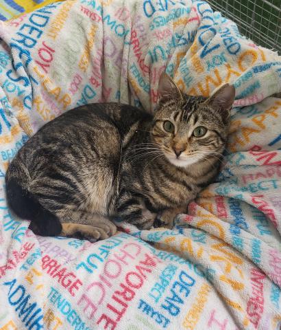 Curro es un precioso gatito atigrado , muy bueno y cariñoso, abandonado en la puerta de una tienda de animales.