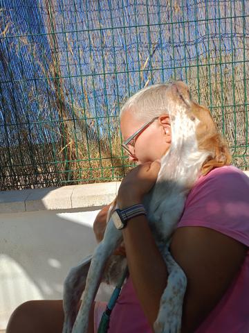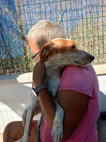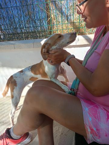 Esta preciosa perrita fue rescatada en nuestro pueblo de Rute. Se estima que tiene unos 9 meses. Es de raza podenco mestiza con manchas marrones y blancas. Puede que la abandonaran en su primera cacería; lamentablemente, nunca conoceremos su corta vida. Pero lo que sí podemos decirles es que es tranquila, muy cariñosa con nuestros voluntarios, cariñosa y segura de sí misma. Al haber estado poco tiempo en el refugio, se dejó llevar por nuestros voluntarios y que la pasearan con arneses. Nos comentaron que estaba muy emocionada en su primer paseo, pero al poco tiempo se adaptó a pasear con otro perro. No mostró ningún miedo al tráfico ni al ruido de las calles por las que la paseaban.